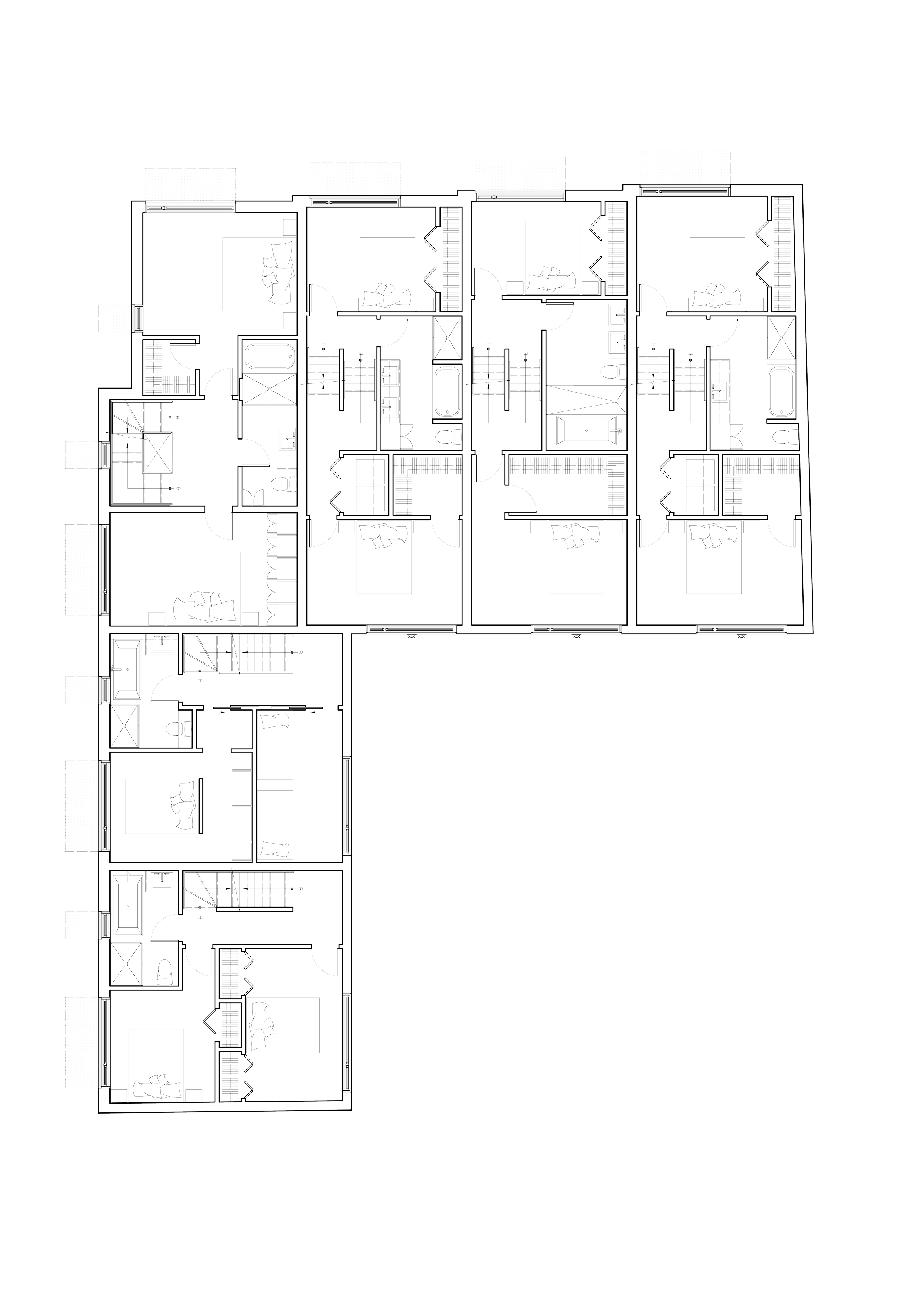 La maison de ville prend la forme d’une ascension en demis niveaux où les pièces sont distribuées de part et d’autre des volées. Ce tronc de circulation vertical est le cœur du logement; il structure l’espace en permettant un grand degré d’intimité dans les chambres puisque chacune est située sur son propre étage. L’aire de vie sur deux niveaux s’ouvre sur un volume très généreux par rapport à sa superficie de plancher et est perché au sommet du logement, là où la vue panoramique sur Québec et les Laurentides est à son apogée. Les vastes terrasses en toiture sont accessibles par les escaliers qui scindent le volume principal et distinguent les unités les unes des autres, leurs silhouettes sont également mises en valeur par un subtil chevauchement de briques. La forte identité chromatique de la brique souligne les lignes franches des ouvertures tandis que les panneaux de fibrociment lisse facilitent la lisibilité des volumes.