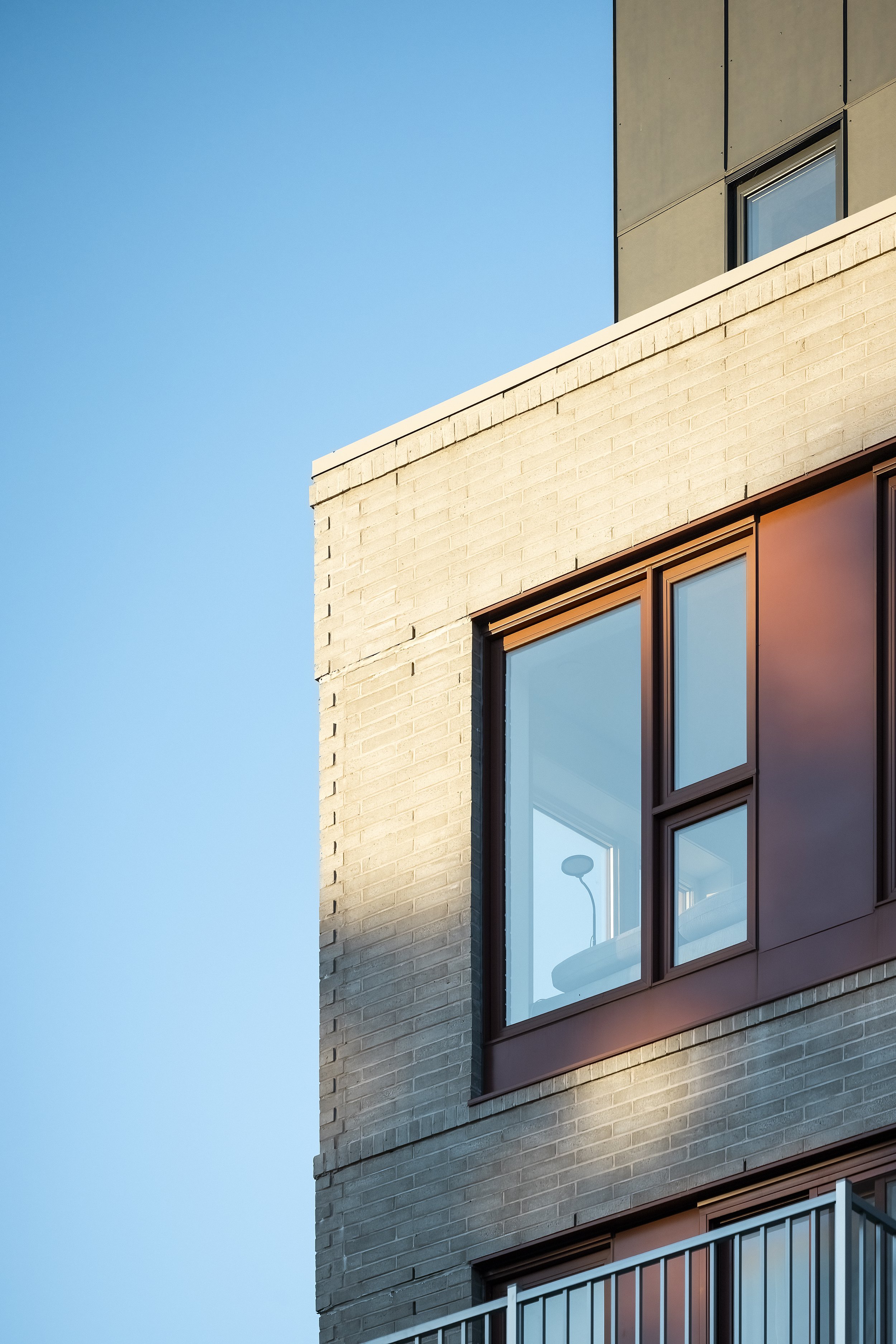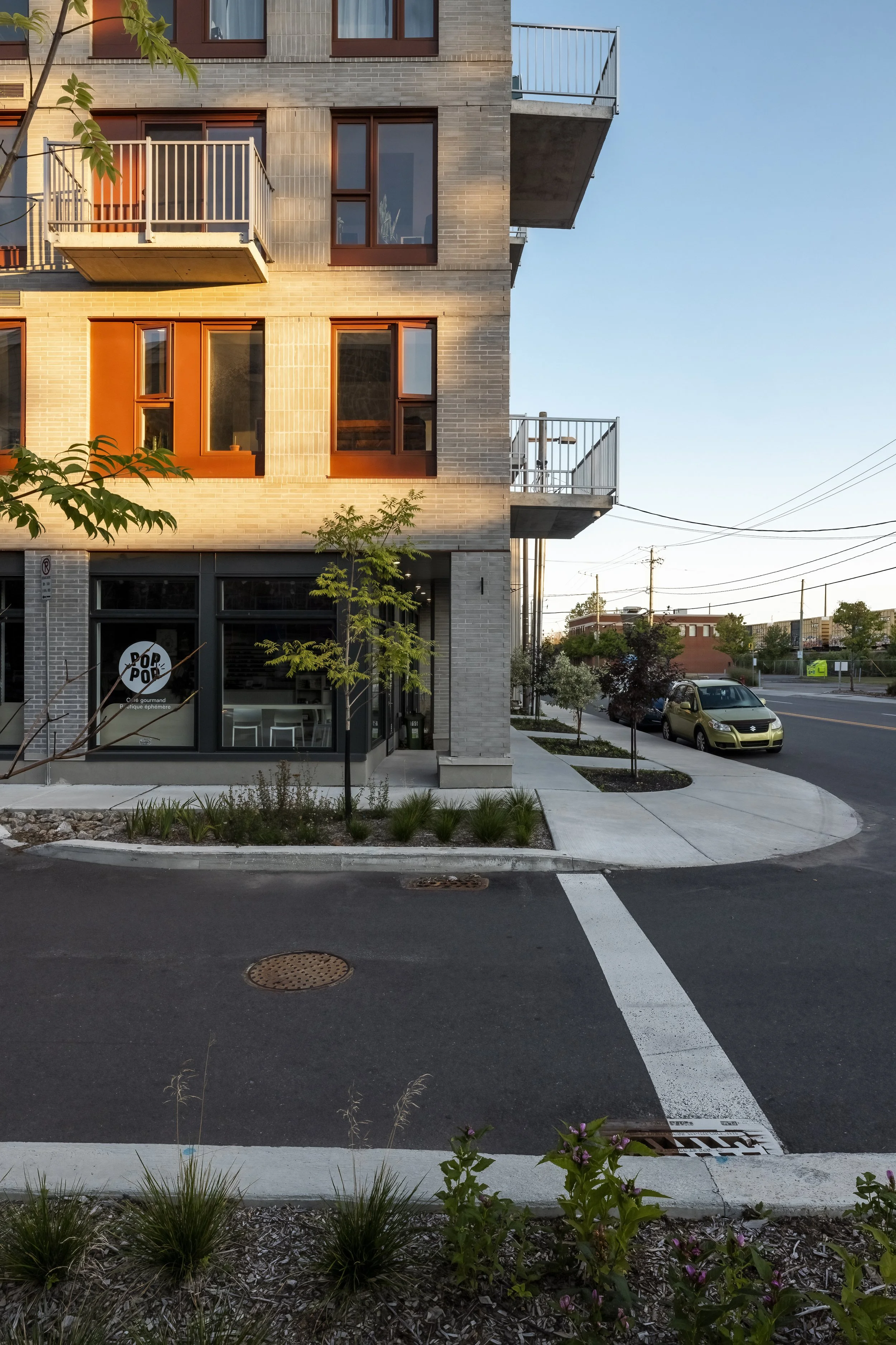 La volumétrie et la palette de couleurs du projet s’inspirent du contexte bâti environnant, tout en permettant de marquer les changements d’usage et d’atténuer la hauteur apparente du bâtiment. Le rez-de-chaussée, paré d’un revêtement léger et contrastant, se distingue des étages supérieurs en maçonnerie tant par sa matérialité que par sa hauteur sous plafond généreuse. Conçu pour offrir une grande flexibilité, le projet permet une adaptation future des espaces commerciaux en fonction des besoins évolutifs du quartier.