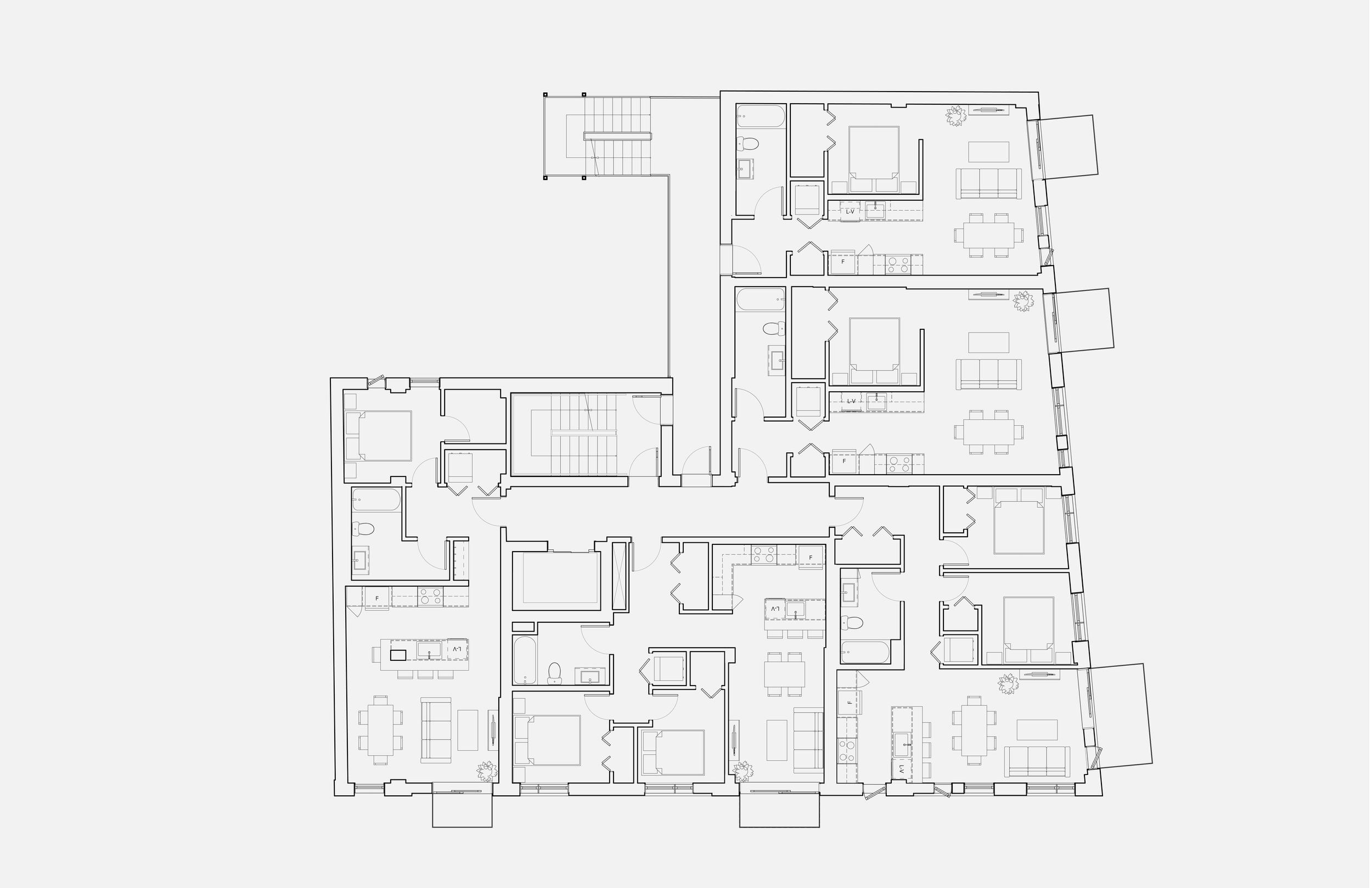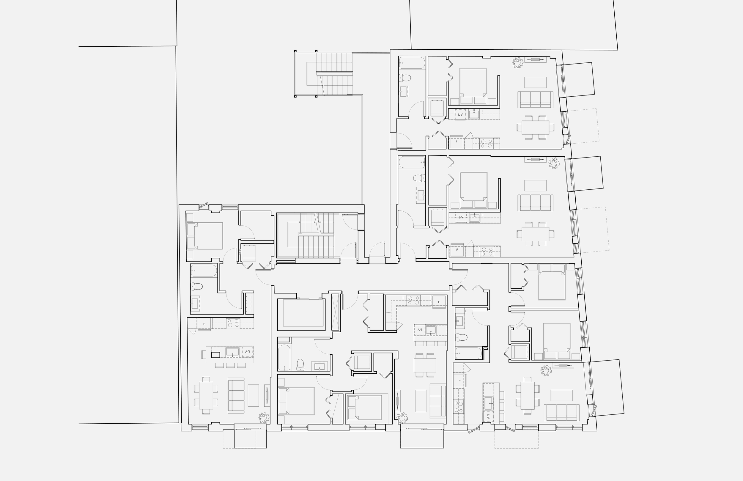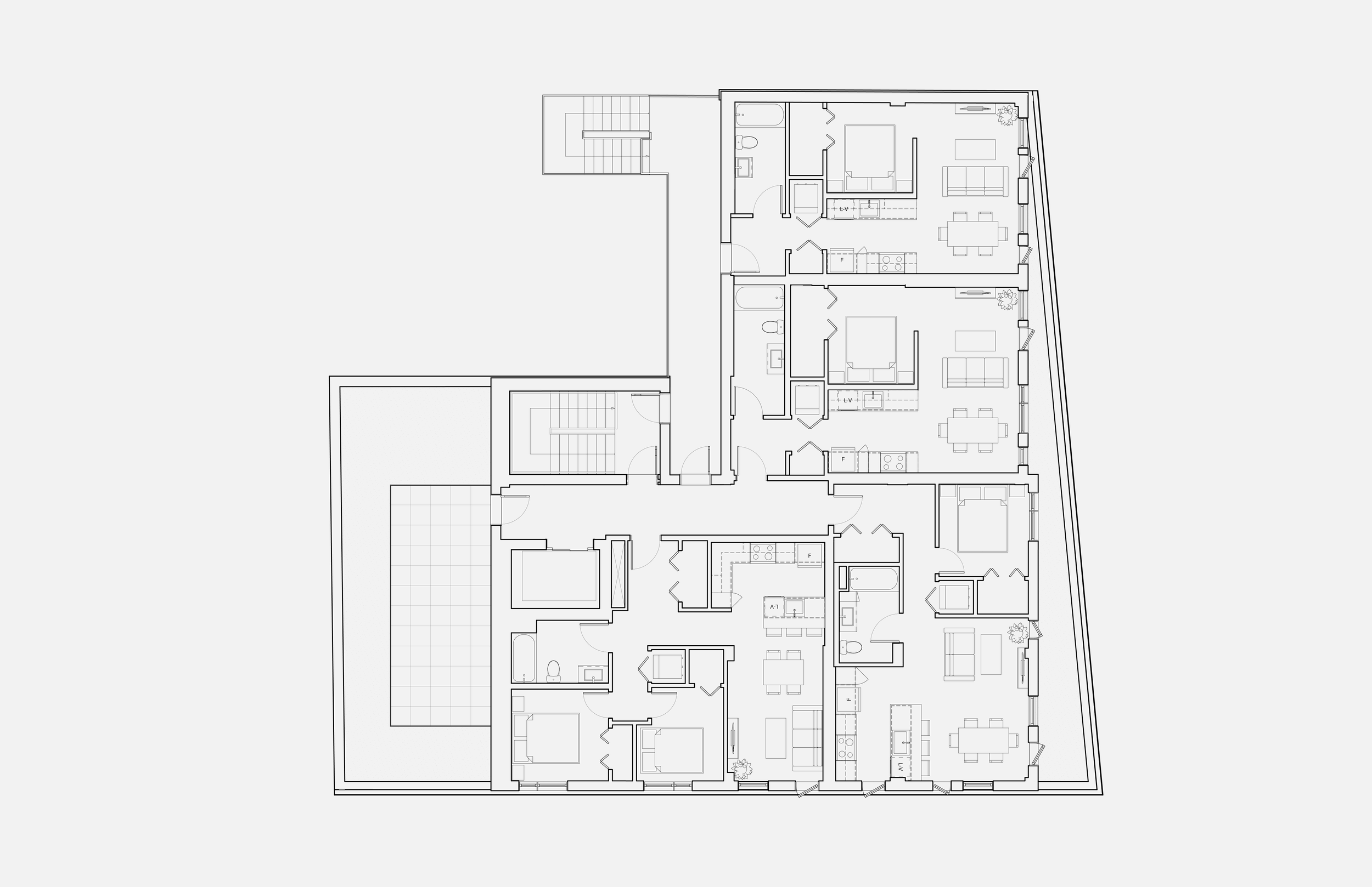 Franky propose un ensemble de 24 logements, du studio au 4 ½, ainsi que trois locaux commerciaux, situés à l’angle du boulevard des Capucins et de la rue de Beaujeu. Au rez-de-chaussée, les commerces s’ouvrent sur le boulevard, tandis que les logements aux étages bénéficient d’une entrée commune plus discrète, accessible depuis la rue résidentielle adjacente. Cette configuration établit une relation intuitive entre les rues et les usages.