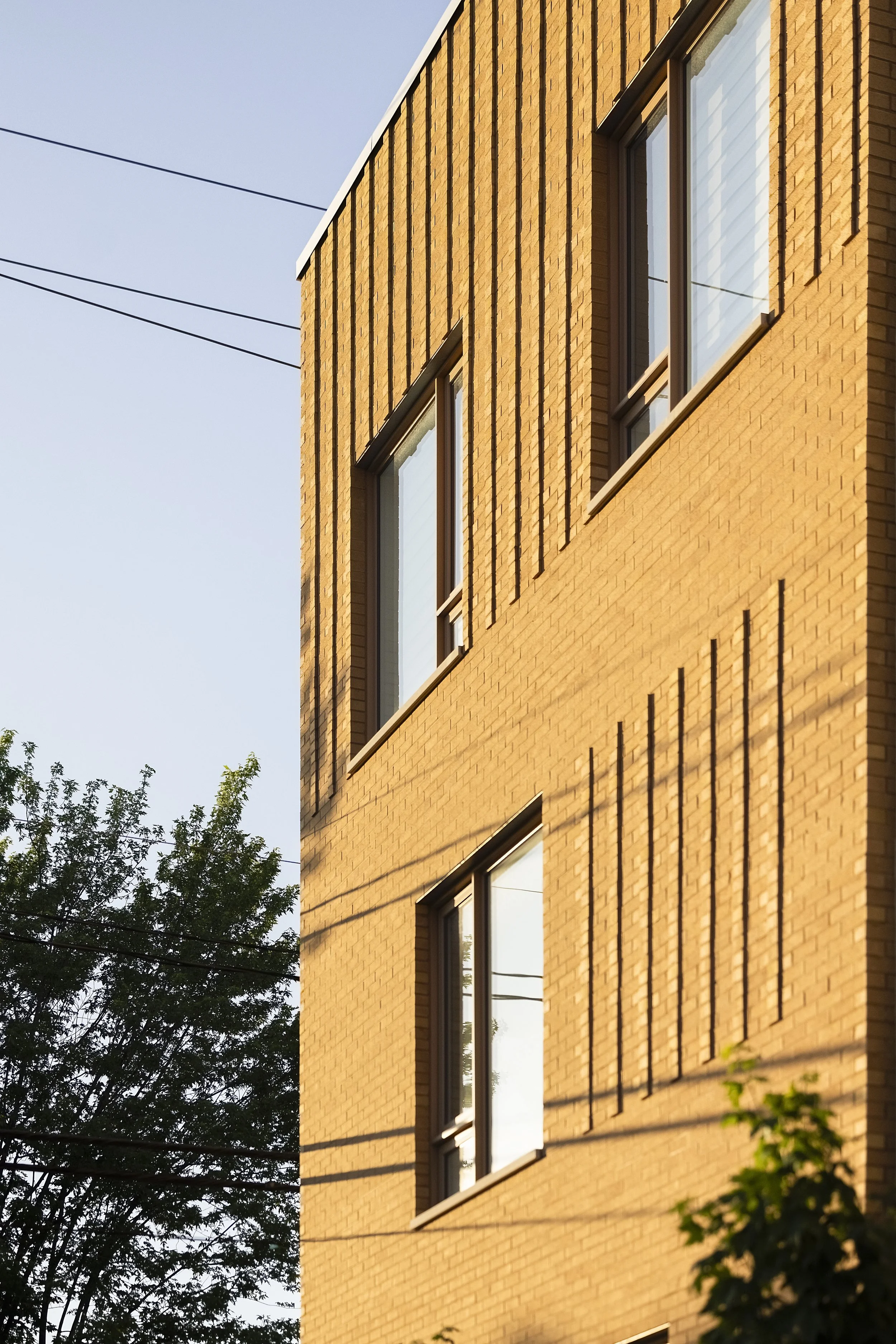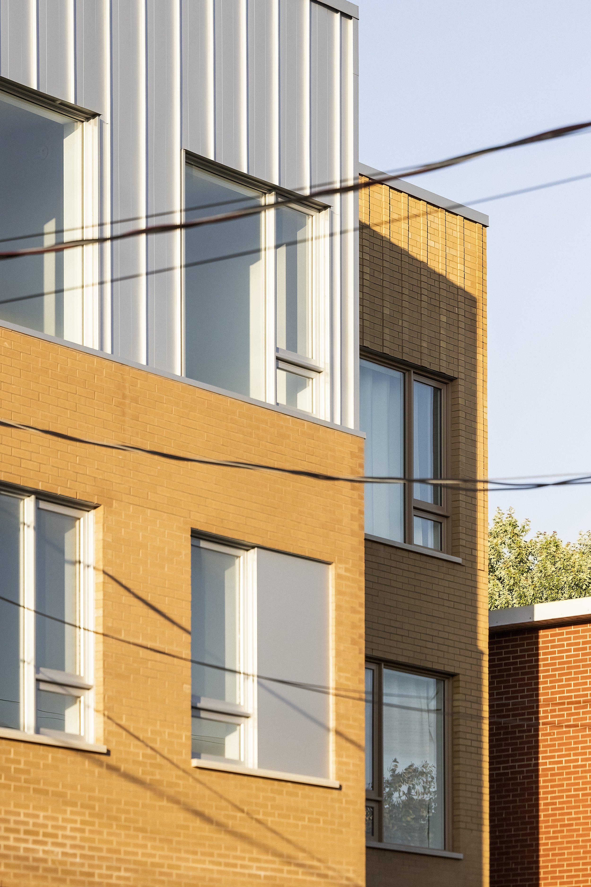 En remplaçant un ancien garage, le projet contribue à une densification douce du secteur tout en s’inscrivant dans la continuité du contexte bâti. La volumétrie du bâtiment est modulée par des décrochés et un jeu de matériaux, notamment un changement de couleur de brique entre les volumes, qui morcèle le projet et allège son impact visuel. Un motif de brique en avancée à ce niveau évoque le jeu d’ombres créé par la tôle à baguette, ajoutant une texture dynamique à la façade.