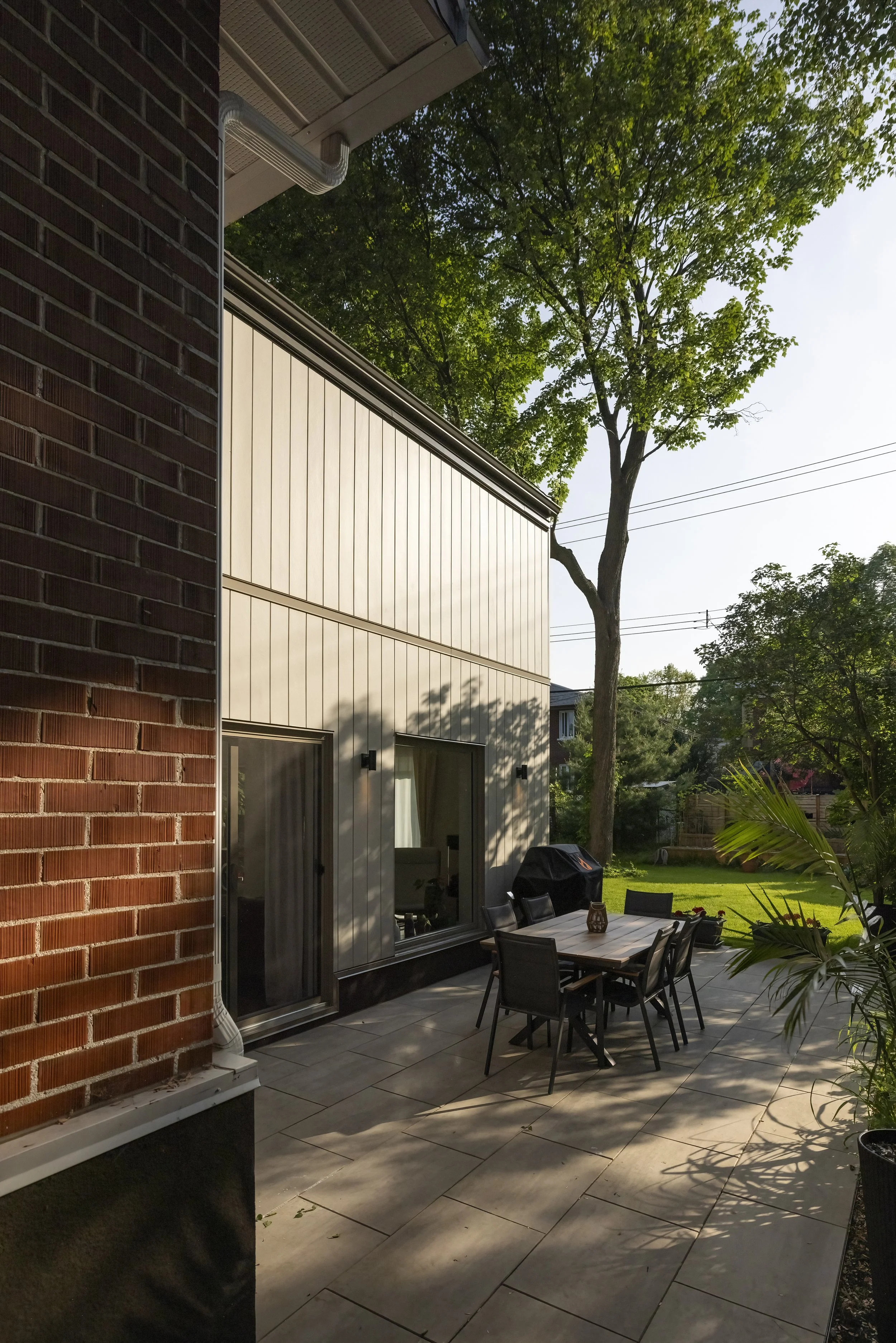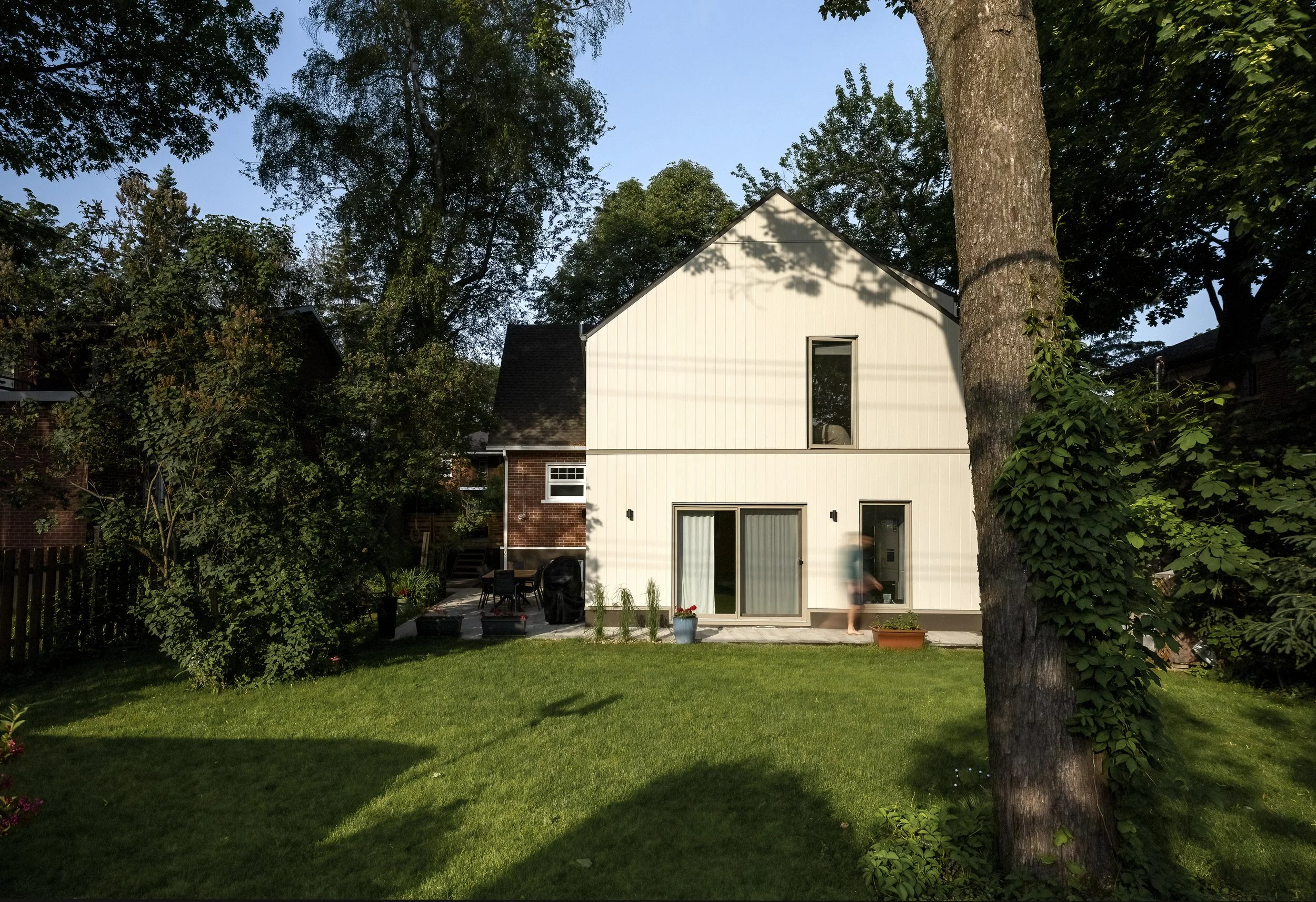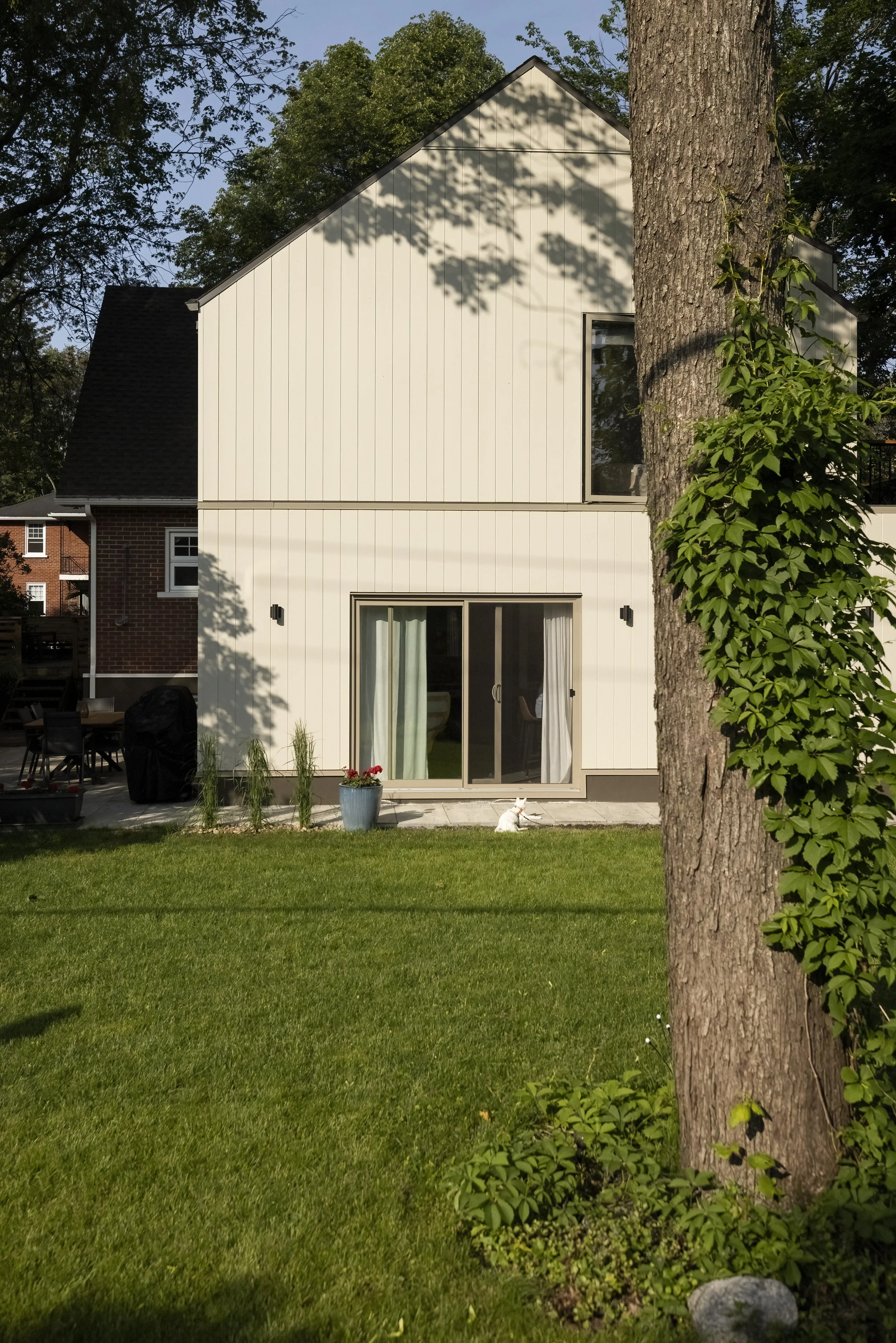 Venant enlacer la maison existante, l’agrandissement se déploie latéralement et vers l’arrière pour connecter harmonieusement les nouveaux espaces aux pièces d’origine repensées. En s’arrimant à l’escalier central, le projet introduit un jeu de demi-niveaux qui redéfinit l’organisation intérieure, créant des circulations fluides entre existant et nouveau. Les pièces de vie principales prennent désormais place au niveau du sol, offrant une proximité privilégiée avec la cour arrière et son cadre boisé.