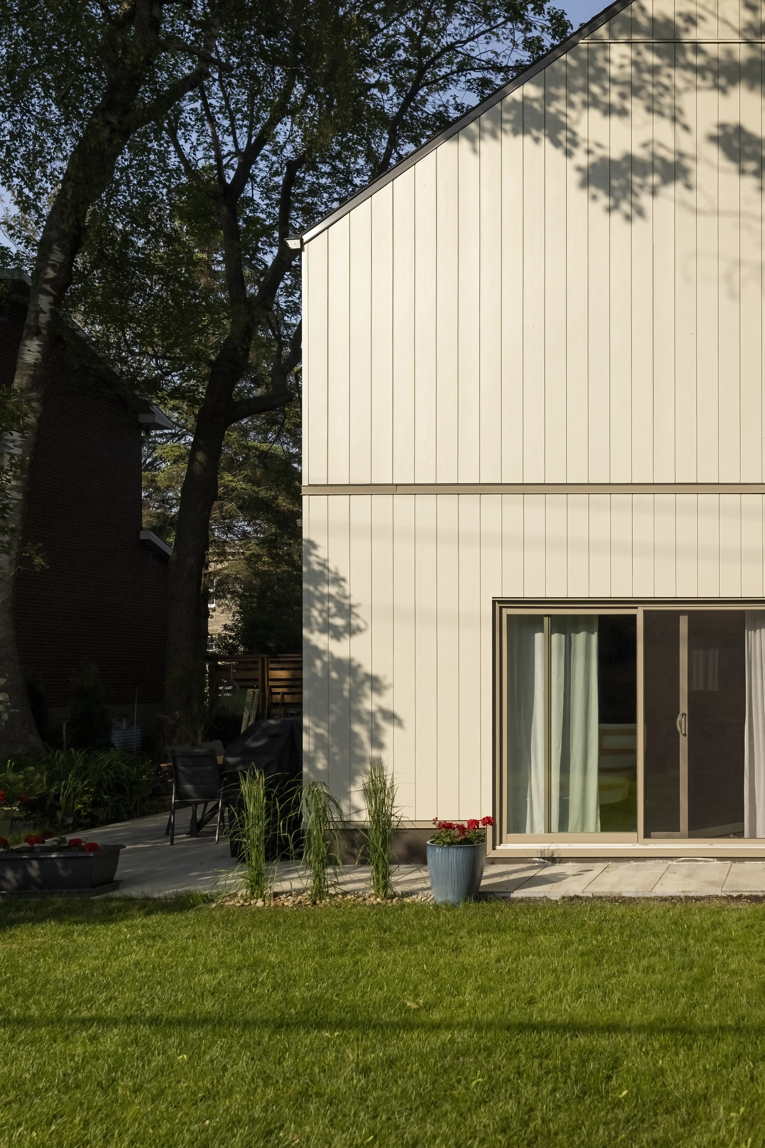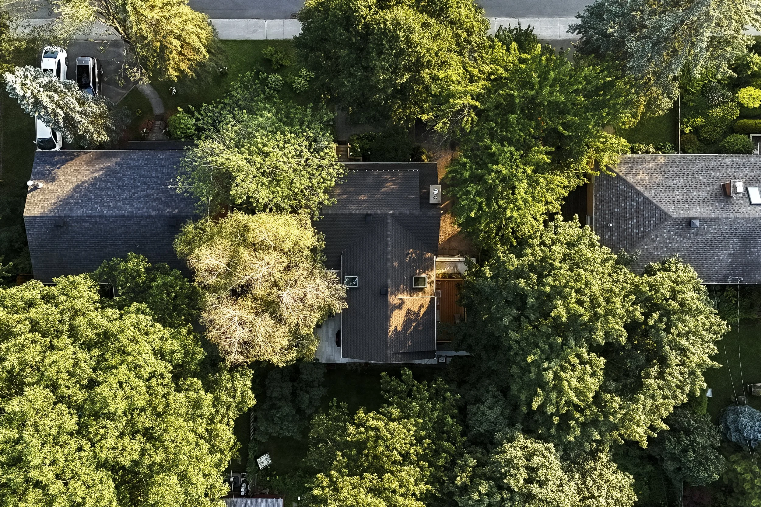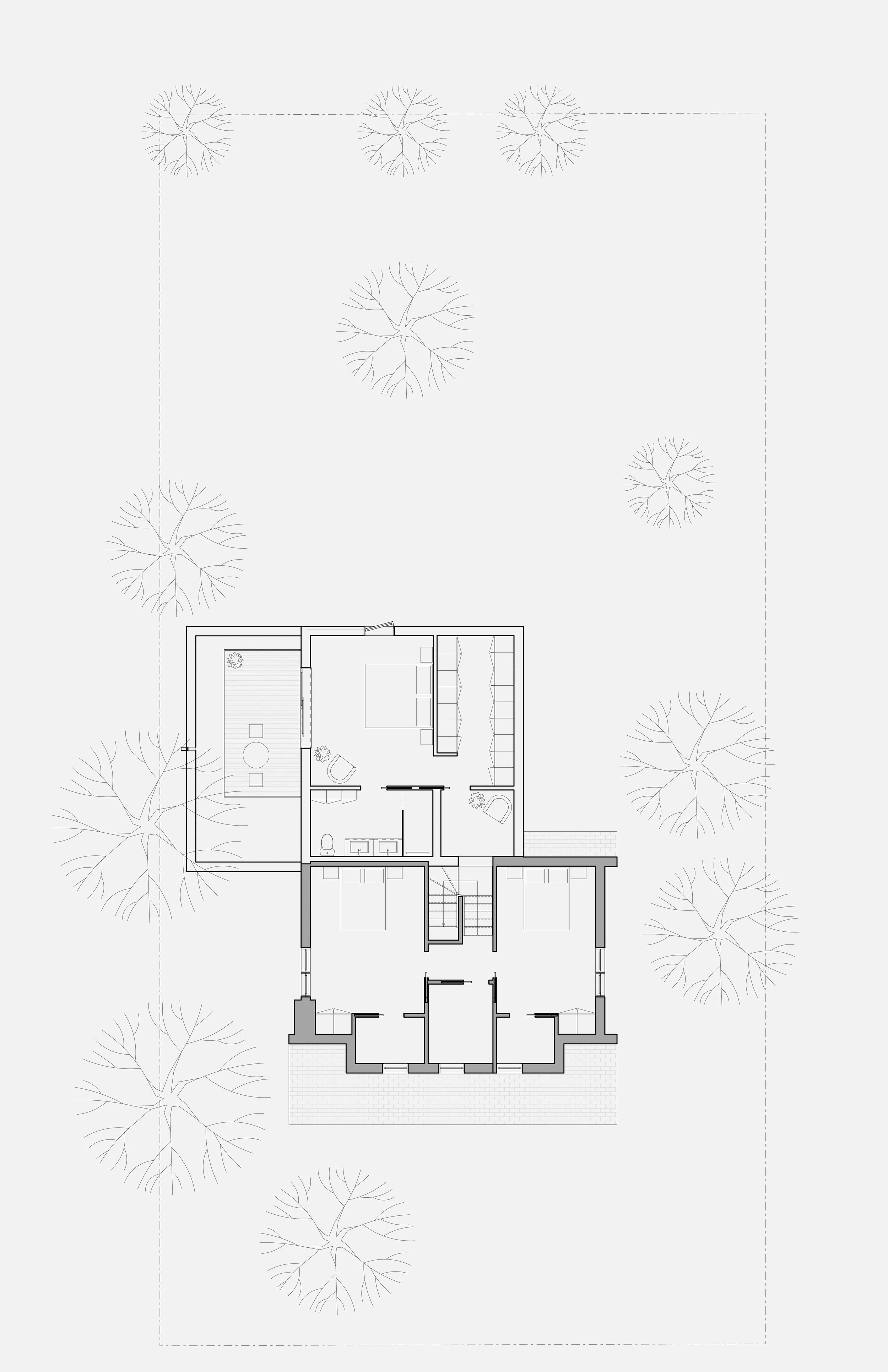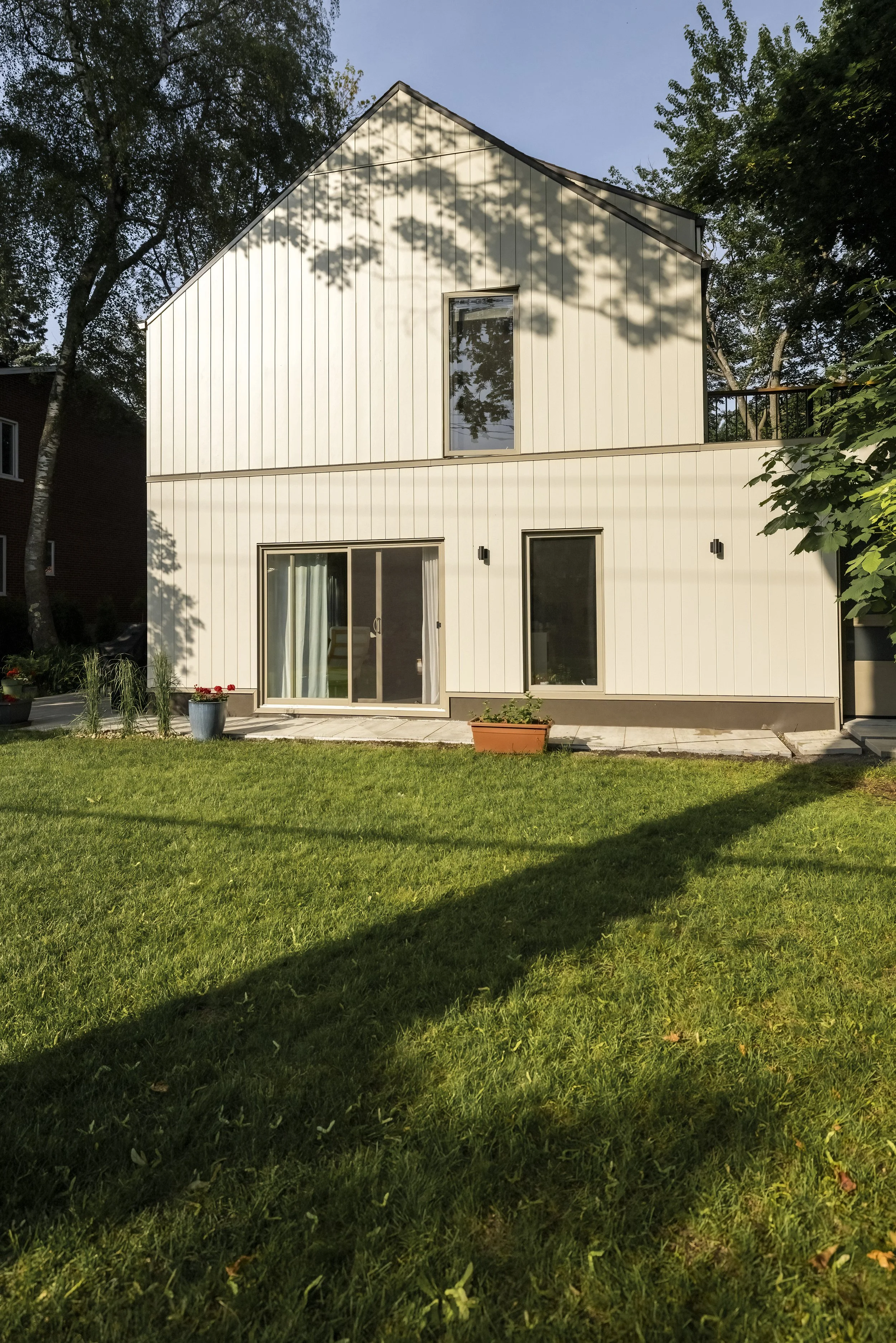 Venant enlacer la maison existante, l’agrandissement se déploie latéralement et vers l’arrière pour connecter harmonieusement les nouveaux espaces aux pièces d’origine repensées. En s’arrimant à l’escalier central, le projet introduit un jeu de demi-niveaux qui redéfinit l’organisation intérieure, créant des circulations fluides entre existant et nouveau. Les pièces de vie principales prennent désormais place au niveau du sol, offrant une proximité privilégiée avec la cour arrière et son cadre boisé.